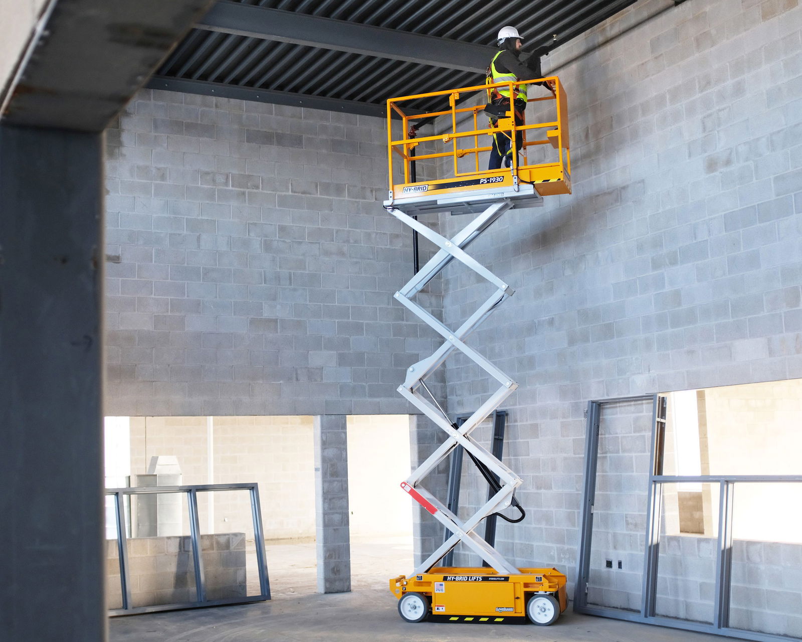 With the new A92.20 standard, the railing heights are increasing. This is causing manufactures to incorporate folding rails in order to fit through standard doors. Hy-Brid’s unique approach allows the PS-1930 to fit through standard doors without fold-down rails, allowing contractors to efficiently move to the next location without wasting time to perform the extra steps of folding down the rails and setting them back up once in place. The lift is also lightweight and compact enough to fit in standard elevators, meaning more access for users on a variety of jobsites. The compact size and maneuverability of the PS-1930 reflects Hy-Brid Lifts’ commitment to helping contractors increase productivity by being the first lift on and the last lift off a jobsite.