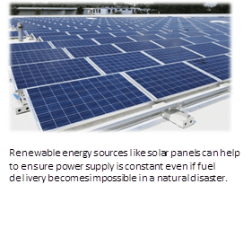 Since solar power with battery backups is not dependent on delivered fuel, on-site solar generation serves as insurance against the risk of fuel interruption by reducing diesel generation and allowing fuel stored on site to be used for longer periods in an emergency. In addition, as a renewable resource, solar systems help achieve corporate sustainability objectives.