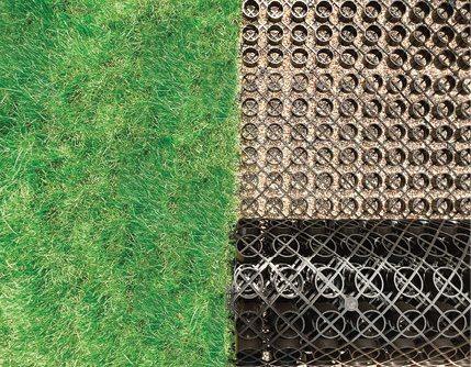 Beyond facilitating a beautiful green landscape, sand infill increases the system’s compressive strength and improves drainage by helping rainwater penetrate the ground. Plastic porous pavers also exhibit excellent inherent compressive strength—up to five times that of concrete—making them suitable for the building’s parking lots, fire lanes and pedestrian walkways.
