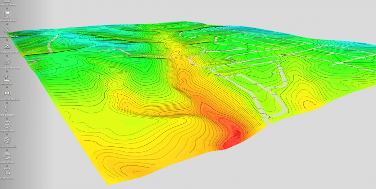 Terrain surfaces can be displayed with contours and elevation themes.