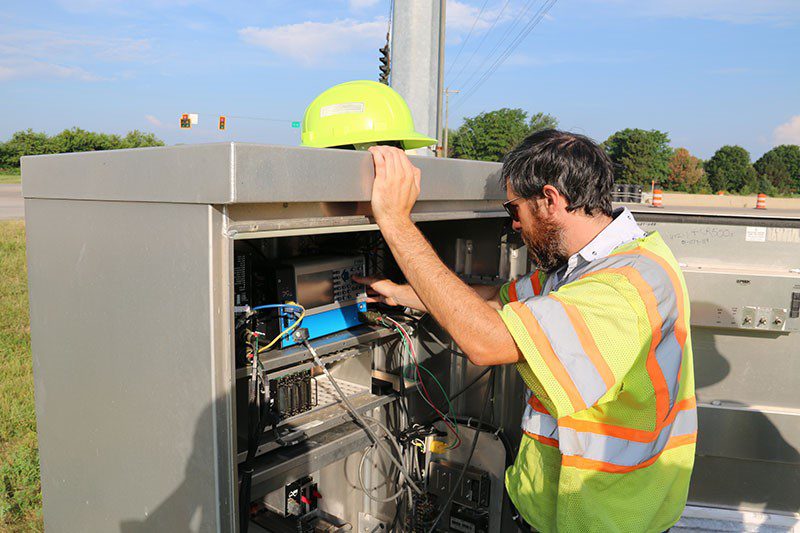 Tom Platte, signal systems field engineer, Indiana Department of Transportation, programming a traffic signal controller. Platte worked with the Purdue researchers to create technology that improves safety as vehicles approach a signalized intersection. (Photo by Howell Li)