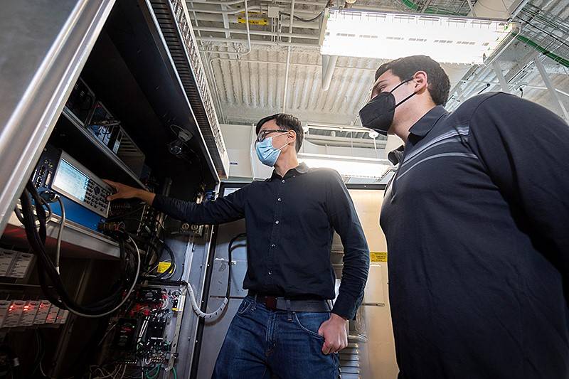 Howell Li (left), principal research analyst in the Joint Transportation Research Program, Lyles School of Civil Engineering, and Enrique Daniel Saldivar Carranza, a Ph.D. student in the Lyles School of Civil Engineering, work on technology that improves safety as vehicles approach a signalized intersection. (Purdue University photo/Vincent Walter)