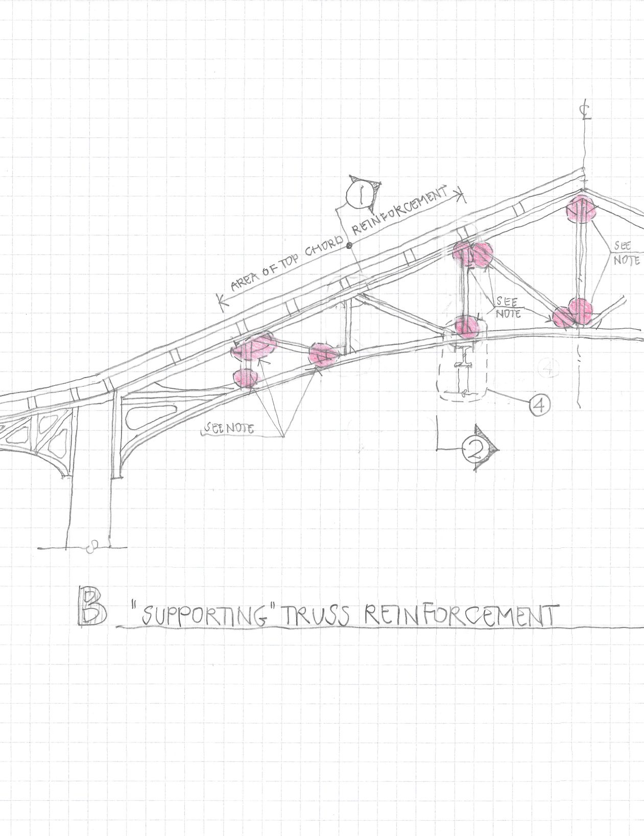 One of my first steps was to sketch the building’s existing support systems and graceful details, working out the stresses and forces in play, and how the original designers and builders dealt with them. Points that occurred to me as I sketched included the following: