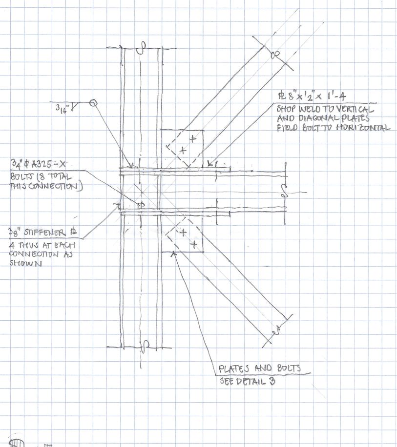 This laborious redesign of the x-bracing system from a few large, welded elements into many small parts suitable for offsite fabrication and onsite piecemeal assembly in difficult conditions is just the sort of work where “mistakes cascade,” as Stewart Brand puts it, potentially resulting in catastrophic delays where all involved lose their composure, not to mention money and a construction season. And design for fabrication and assembly is something of a specialty where computer-aided drafting and modeling is held to be especially useful, if only for precision and clash detection. My many and detailed hand drawings helped understand the conditions, find ways to address the issues structurally and visually explain how the steel reinforcement structure was to be fabricated, assembled and installed.