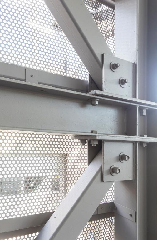 “Our solution was to mask this industrial-looking, steel x-brace system spanning the entire vertical elevation of the building with custom fabricated decorative panels. These screen-like panels not only convert a potential eyesore into an aesthetic accent, but they also serve a practical role by allowing light into the home and residents to see out of their home. The creation of this aesthetic and structural solution as well as its installation was only achieved through close collaboration and coordination with the structural engineer and the steel fabricator.”