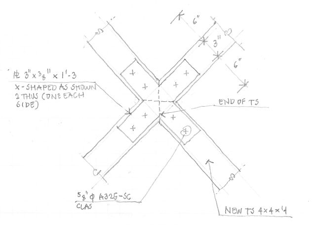 Returning to the truss design, we analyzed the new loading, determined allowable stresses and found that certain truss elements were overstressed. To compensate, I added additional angles to the top chord. I also stipulated replacement of original rivets with A325 bolts where required.