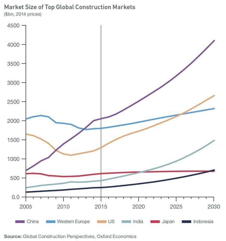 A new report, “Global Construction Perspectives, Oxford Economics,” estimates that the growth in American construction activity will actually outpace China during the next 15 years, averaging 5 percent growth per year.