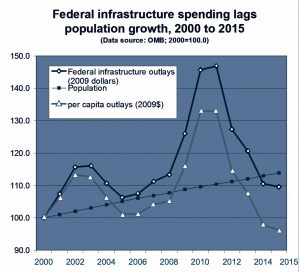 The eight-page paper (at http://bit.ly/2ufaNxz), “Collision Course: Infrastructure and U.S. Population Growth,” researched and written by Edwin S. Rubenstein, notes that although the percentage of infrastructure spending in the U.S. economy has collapsed, population growth remains on its upward trajectory—a recipe for potential future disasters.