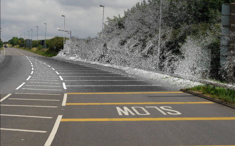 LiDAR scan data (above) provide the input for 3-D modeling and rendering, which was created in Autodesk InfraWorks. Credit: CALTROP