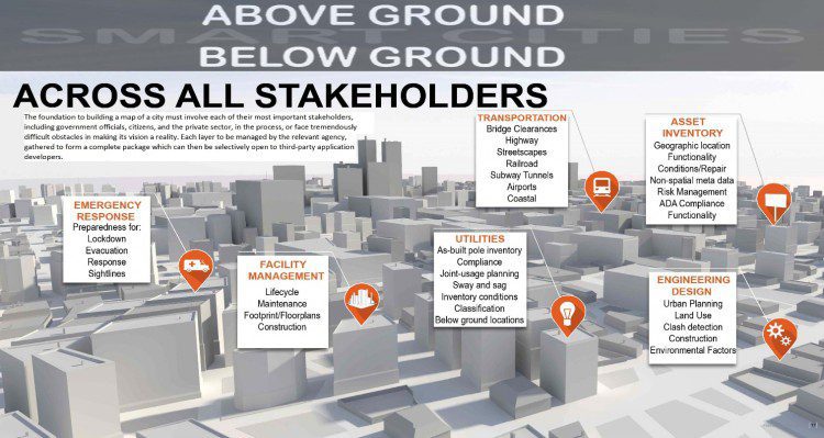 It’s critical to understand above- and below-ground data and their associated data owners. Building a city map must involve each of the important stakeholders, with each layer managed by the relevant agency and then compiled into a complete package that can be made available to third-party application developers. CREDIT: Terrametrix