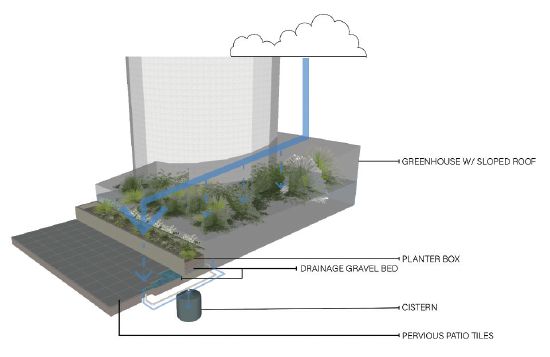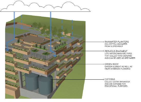 Remotely operated and self-cleaning rainwater harvesting systems capture rainwater from solar-panel canopies. Green infrastructure such as green roofs and green facades reduce demand for potable water and electricity at the EC while also improving campus aesthetics and promoting carbon sequestration.