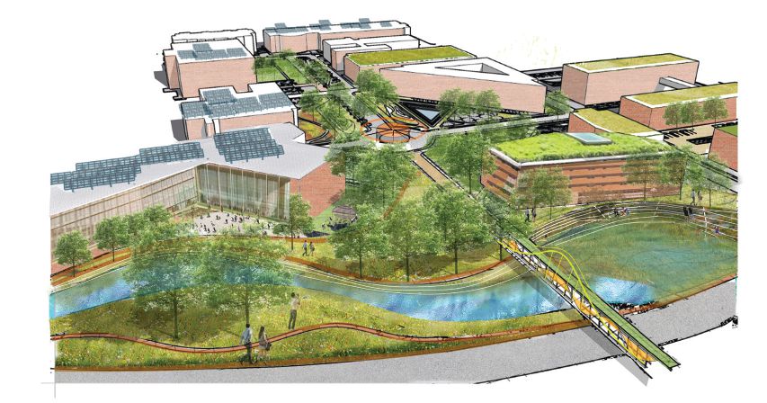 “From that frame of reference, we worked to provide solutions that benefited the university and surrounding region in terms of stormwater mitigation, but we also wanted to focus on the students and how our campus could become more unified, useable and beautiful,” he says, adding the team regarded the approach as providing the greatest benefits.