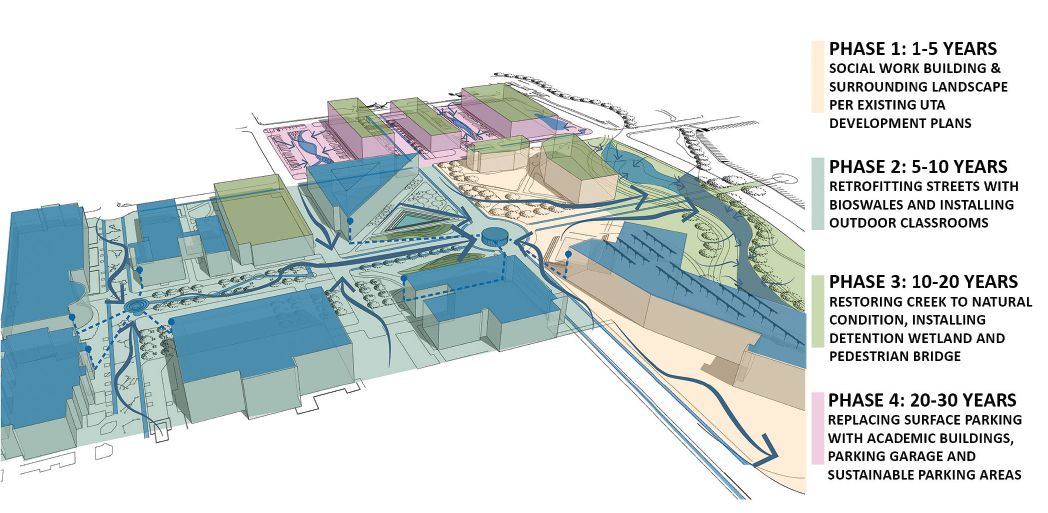 Teams documented and analyzed regional, city, campus and site-level abiotic, biotic and human conditions and factors shaping the growing urban campus. Students identified areas of interest to help meet the campus master plan as well as provide the best environment to showcase innovative and resilient green infrastructure solutions.