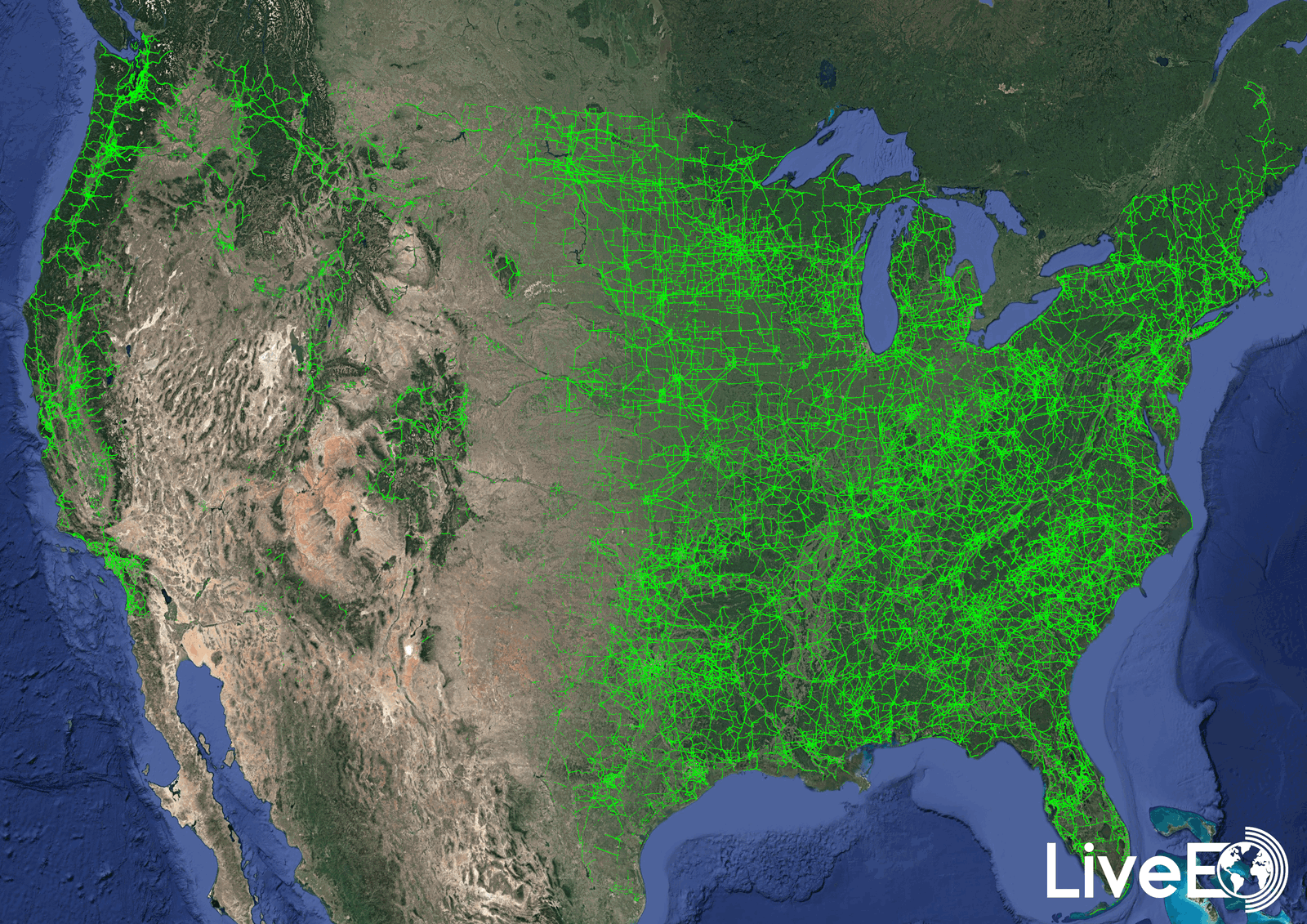 The goal of this large-scale analysis was to demonstrate LiveEO’s market-leading analytic capabilities to a North American audience. In total, over 15,000 public satellite images were used to evaluate risk to 574,000 miles of electricity lines. (Details about the analysis can be found at www.live-eo.com/us-power-transmission-grid-analysis)