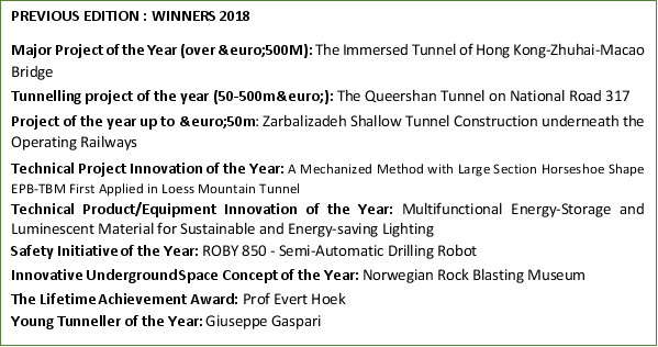 Since 2015, the international competition "the ITA Tunnelling Awards" seeks and rewards the most ground-breaking innovation and outstanding projects in tunnelling and underground space use. This year the event took place in Miami in conjunction with Cutting Edge Conference of UCA of SME. After editions in Hagerbach (Switzerland), Singapore, Paris (France) and Chuzhou (China), the fifth ITA Tunnelling Awards moved to the United States of America for the 2019 event. The four previous editions of the ITA Tunnelling Awards received 333 entries and 139 nominations, rewarded 41 projects and personalities and gathered almost 1000 attendees.