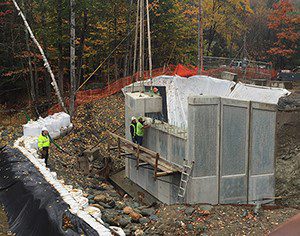 HAWLEY, Mass. (January 2018) — Partnering with the Massachusetts Department of Transportation, engineering firm McFarland Johnson and general contractor Clayton D Davenport Trucking, Oldcastle Precast Rehoboth, Mass. provided the precast concrete bridge components for the entire substructure, besides the footings, to replace the Savoy Road Bridge over the Chickley River.