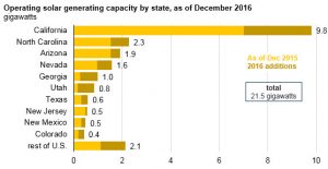 In addition to utility-scale solar, electric-generating capacity from small-scale solar systems (such as rooftop and other customer-sited PV systems) has grown. In 2016, EIA estimates that the United States added 3.4 gigawatts (GW) of small-scale solar generating capacity across all three end-use sectors (residential, commercial and industrial), ending the year with more than 13.1 GW of installed capacity. Monthly generation from small-scale solar capacity is estimated to have been 1.6 million megawatt hours on average in 2016, or about two-thirds of the amount generated by utility-scale solar generators. For more information, visit www.eia.gov/todayinenergy/detail.php?id=31072.