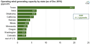 The increase in U.S. wind development during the last decade reflects a combination of improved wind-turbine technology, increased access to transmission capacity, state-level renewable portfolio standards, and federal production tax credits and grants. More than half of U.S. wind capacity is located in five states: Texas, Iowa, Oklahoma, California and Kansas. In three states—Iowa, Kansas and Oklahoma—wind makes up at least 25 percent of in-state utility-scale generating capacity. For more information, visit www.eia.gov/todayinenergy/detail.php?id=31032.