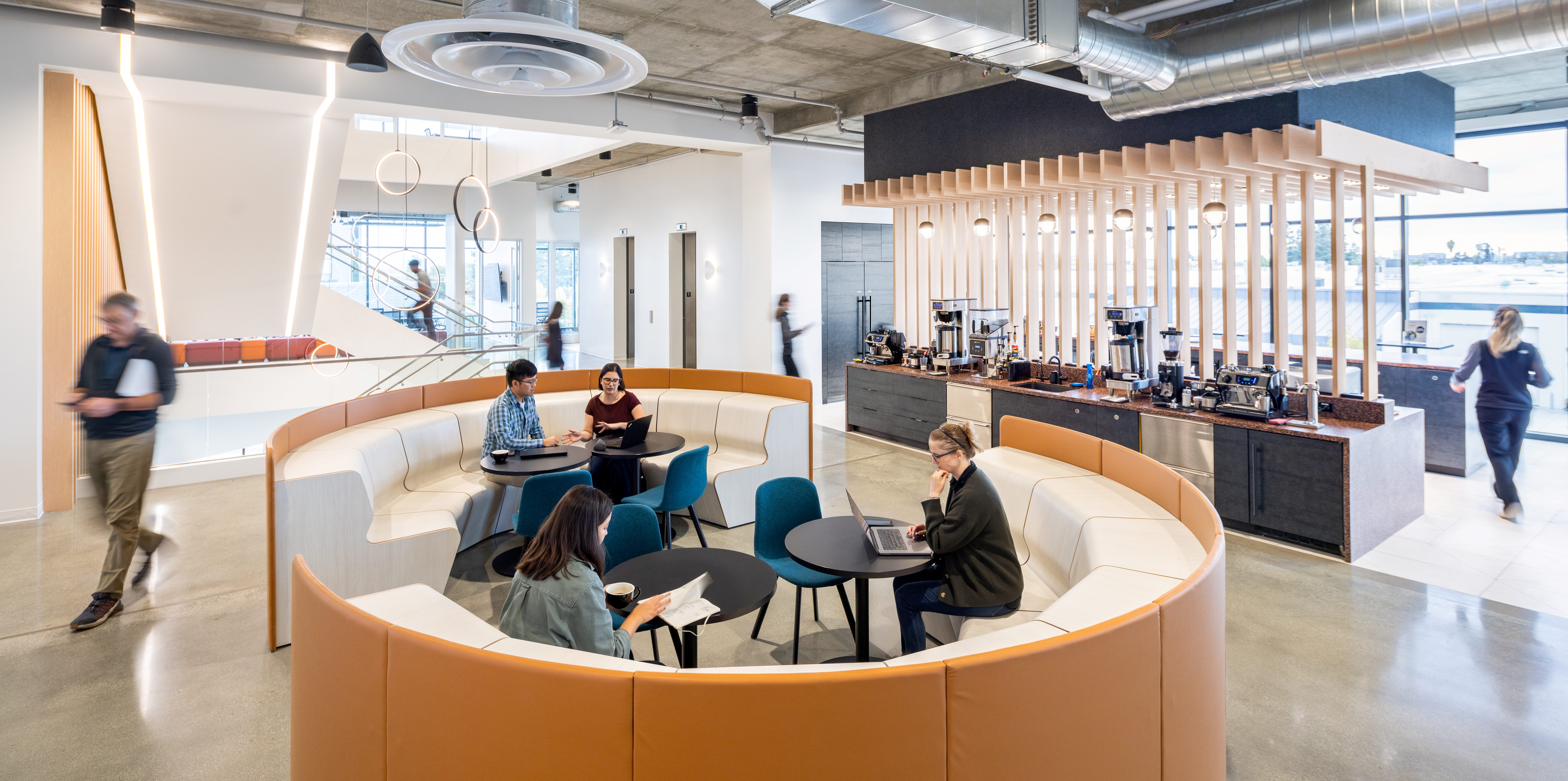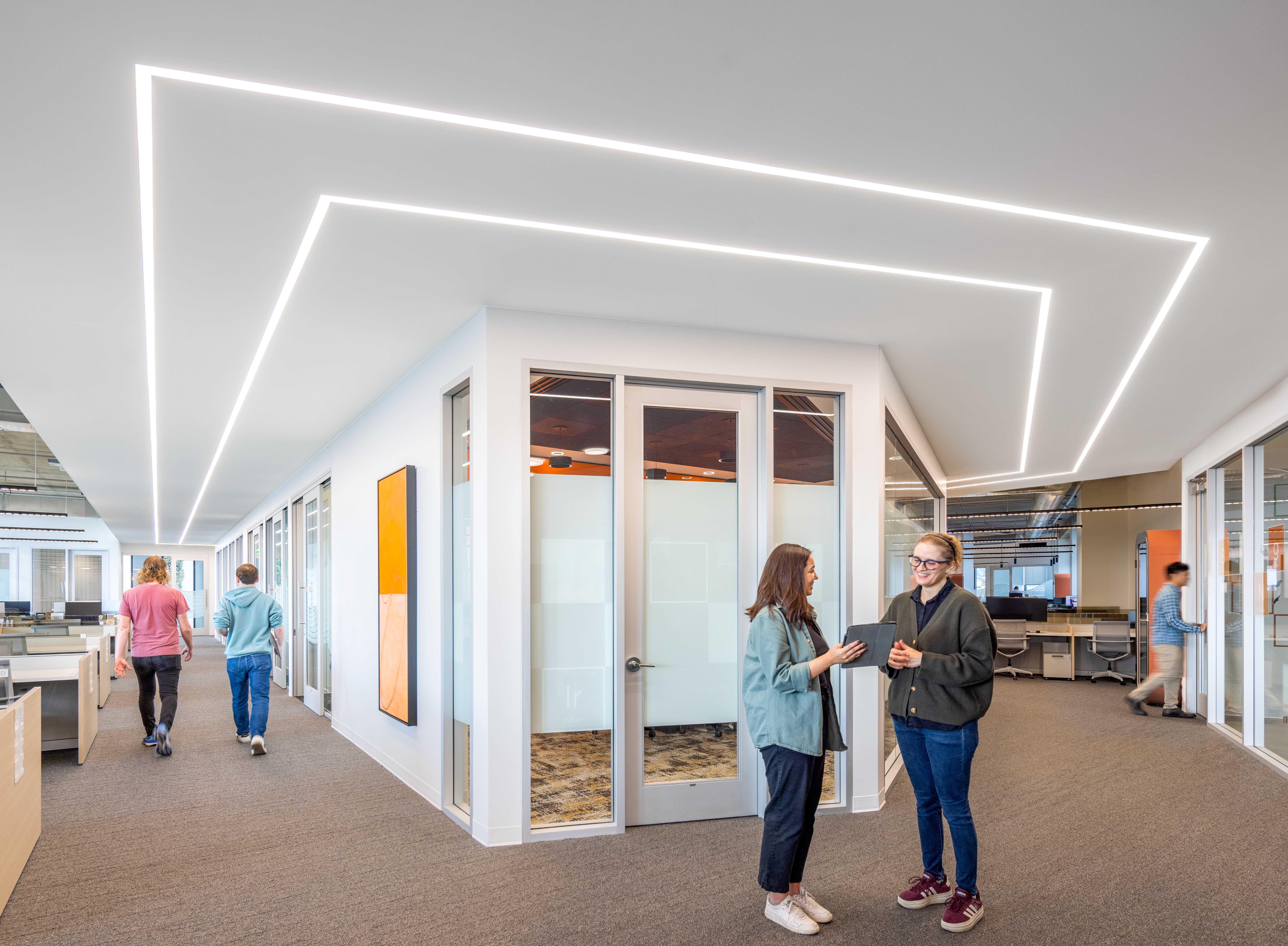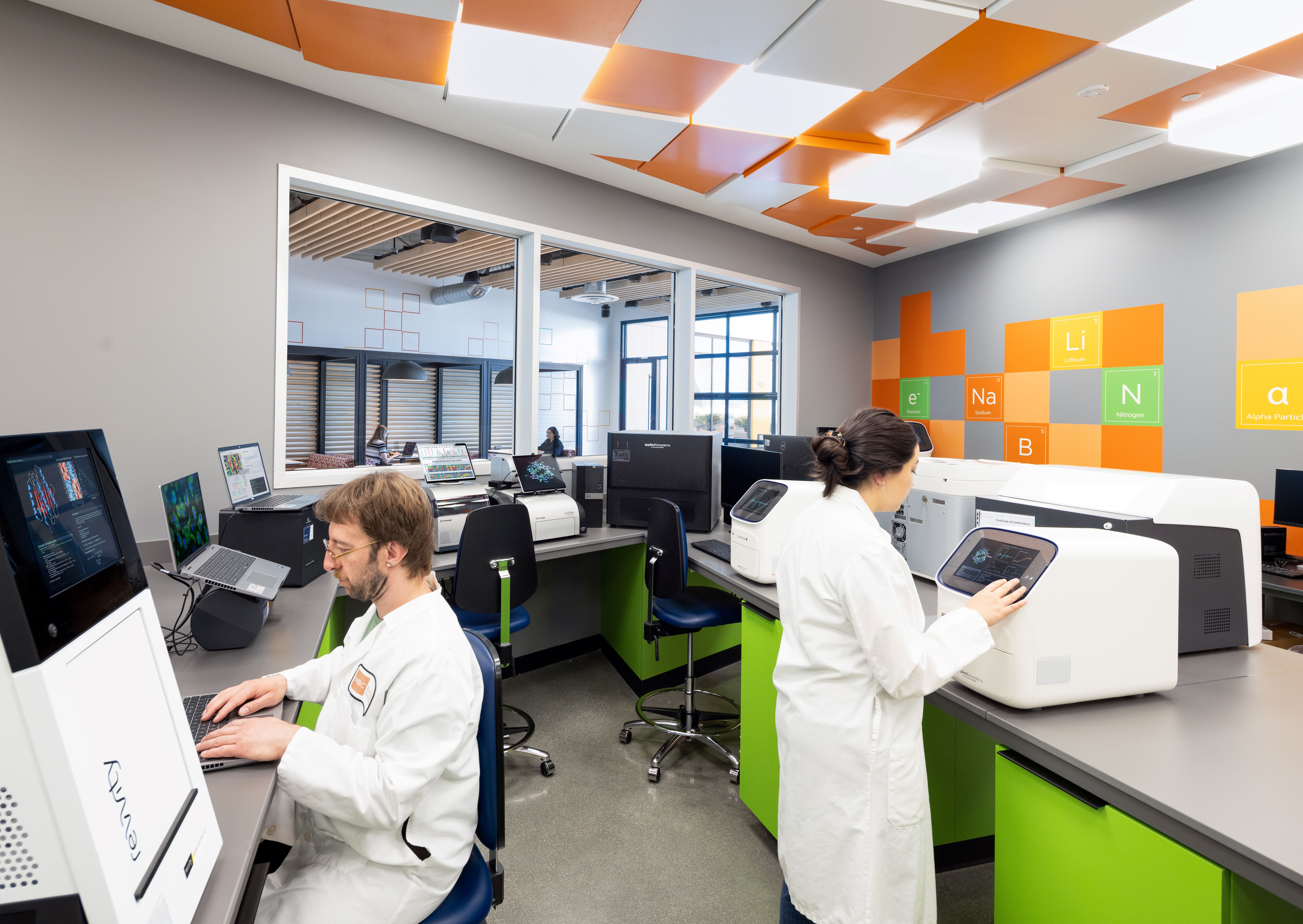 Material Expression and Technical Coordination The architectural language balances the performance requirements of laboratory environments with a measured sense of warmth. Exposed concrete structure and systems are complemented by rift-sawn white oak, custom acoustical treatments, integrated graphics, and layered lighting. Lighting design, developed in collaboration with ALR, incorporates fixtures from Fluxworks, Bega, Delta Light, and Lumos to support both laboratory precision and workplace comfort. Behind the scenes, the project required robust mechanical and electrical systems to meet the demands of incubator laboratories. A design-build MEP approach, closely coordinated between MBH and contractors, supports high-efficiency HVAC, optimized ventilation for safety and performance, and infrastructure capable of accommodating tenant turnover and evolving research needs.