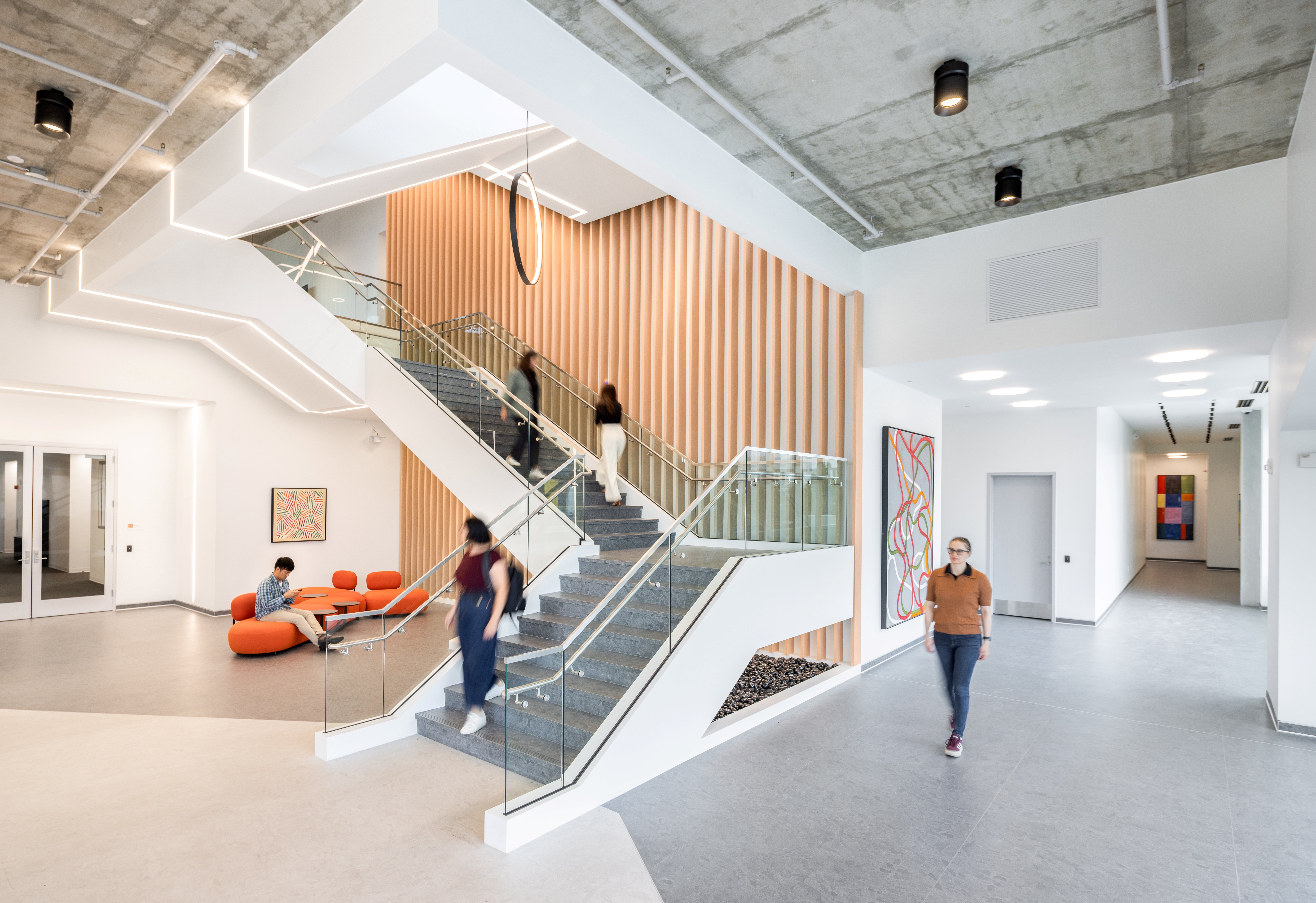 A Defined Arrival and Campus Presence Elevated above grade to address floodplain requirements, the building establishes a strong presence along Brittan Avenue. Custom GFRC cladding, expansive glazing, and a 45-foot-high open-air entry stair define the arrival experience. Wood fins and sculptural lighting accent the stair, creating a visible and active threshold into the campus. |