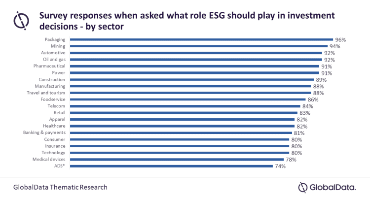 The ADS sector also came at the bottom of a question asking whether ESG played a role in decision making, with 74% responding that it played a major role, compared to the top performers: packaging, at 96%; mining, at 94%; automotive, at 92%; and oil & gas, at 92%.