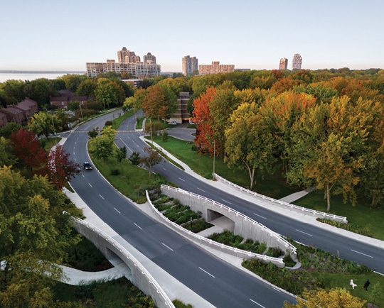 At the same time, Provencher Roy makes room in its practice for more-humble civic projects, including the reconstruction of the Darwin Bridges on Nuns’ Island (in the middle of Montreal in the Saint Lawrence River). It’s not often that a pair of two-lane bridges and a pedestrian and cycling underpass receive the concentrated attention of a world-class design firm, but such is the case here: the elegant, understated form of the new bridges as well as the novel and efficient material choices elevate what could have been utilitarian urban infrastructure to something like a destination in itself—a new island landmark. This is partly out of respect for the original structures.