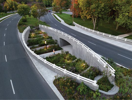To pull off this balancing act, Provencher Roy based its bridge design on swooping, curved formwork (a design that won over Montreal planners); eliminated galvanized iron guardrails; integrated a security buffer of more than