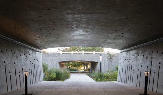 Reconstruction of the underpass also was a design priority. Starting from the highway, two circular arches descend the slope toward the cycling path, delineating the pedestrian crossing enclave; the central median strip between the two bridges was opened up and dug out; and stepped retaining walls were built to create a terraced and lushly planted “secret garden” visible only to those on foot or bike.