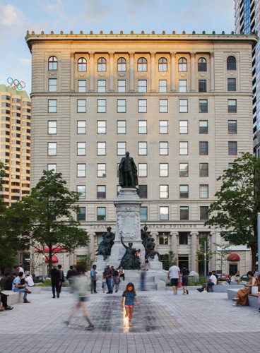 All in all, the reimagining of Sainte-Catherine Street West and Square Phillips—in the midst of the busiest zone in what might be North America’s most beautiful city—appears to be a universally popular and unqualified success on all levels, from desperately needed subsurface infrastructure rehabilitation to street-level reallocation of vehicle and pedestrian space to the top of a massive monument and the airy canopies of hundreds of new shade trees. And, given the close involvement of Provencher Roy and many more local designers, artisans and builders, it also seems to be a reimagining “by Montrealers for Montrealers.”