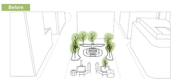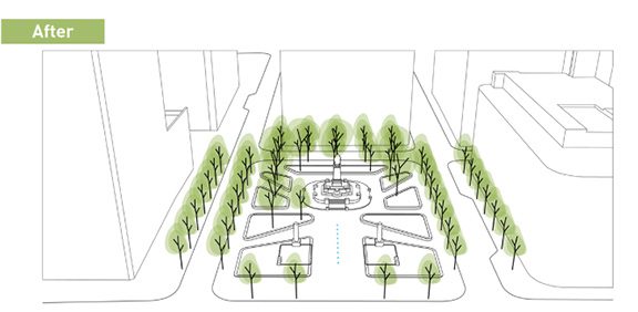 Existing trees and plantings at Square Phillips were increased 14-fold, pedestrian space was expended, and built infrastructure was eliminated and/or streamlined.