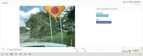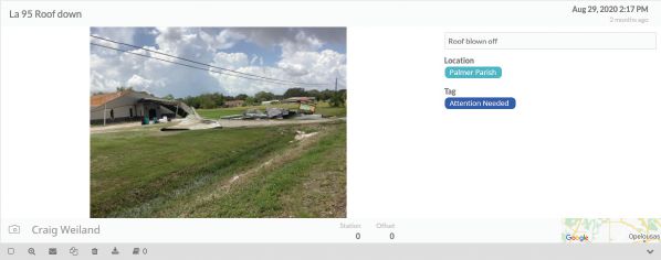 Images of hurricane damage captured by DOT workers in Louisiana with HeadLight’s Fieldbook include robust metadata such as precise location, date and time stamp. Open data sources allow DOTs to aggregate and integrate information across platforms, increasing their speed and accuracy when applying for federal aid. Image Courtesy of HeadLight