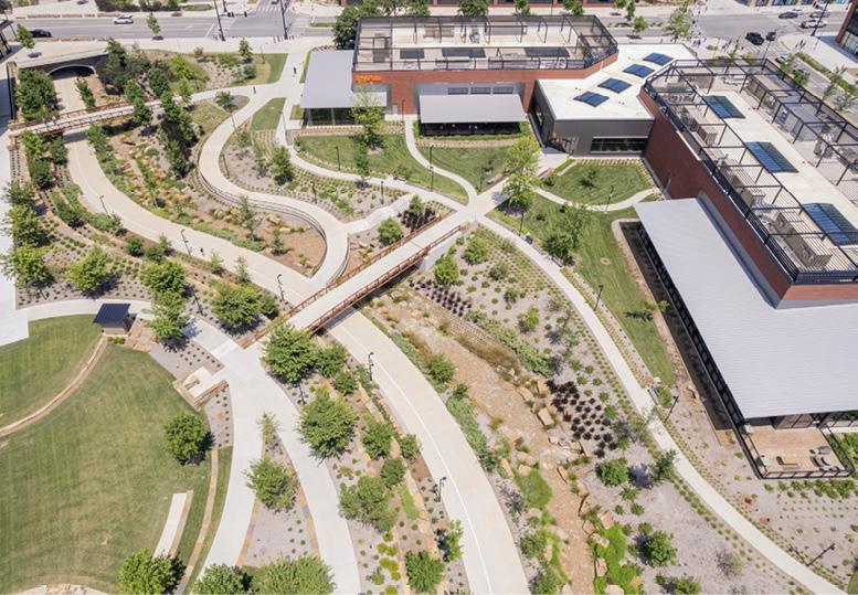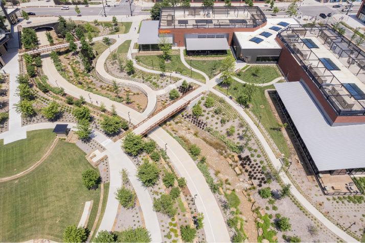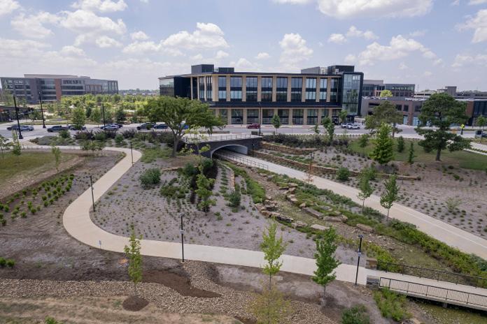 “Big Nature and the LID-based approach to managing stormwater runoff onsite minimizes impact on water quality, and both played a key role in the campus design,” says Gus Leutermann, senior associate and senior civil engineer at Walter P Moore. “The specific elements of LID, including the integration of bioswales along major roadways and conveyance paths, prove effective in attenuating stormwater runoff and reduce infrastructure costs across the campus.”