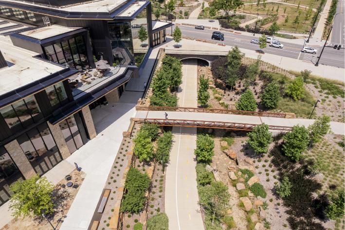 “To improve pedestrian safety and eliminate vehicle-pedestrian conflicts, a street parallel to the campus was raised 10 feet while another roadway on the campus was elevated by 7 feet to enable pedestrian tunnels in place of traditional intersections,” adds Peek.