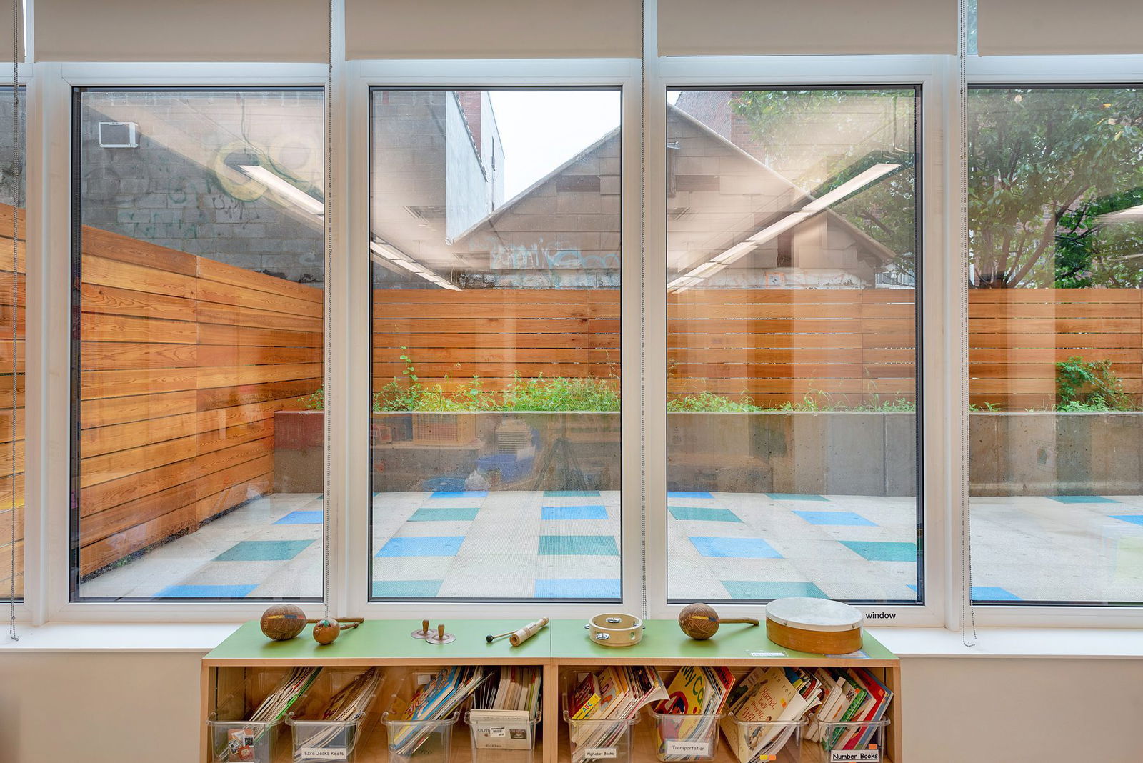 Further, the pre-K space is connected to the base building’s energy-recovery system. CTA worked with its Passive House consultant, YR&G New York (now WSP USA Inc.)– and the Association for Energy Affordability (AEA), the Passive House consultant for the base building – to incorporate the same systems and energy-efficient approach that the base building had. A variable-refrigerant flow (VRF) condenser was installed on the roof of the HANAC building for the pre-K space, for example. “In this way, the mechanical systems keep the energy found inside the envelope recirculating fresh air. This not only lowers the energy load, it maintains a much cleaner, healthier environment,” Tooman added. The pre-K has a separate entrance from the senior center and uses the same triple-glazed storefront system.