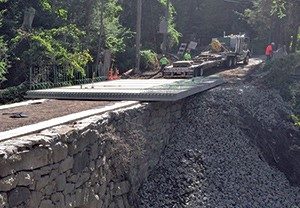 The precast concrete slabs were prestressed to resist the required construction loads and to carry the required in place design loads. Instead of orienting them in the normal longitudinal direction, the slabs were installed transverse to the roadway, extending out roughly 5 ft beyond the existing stone masonry walls. Installation of the slabs took just 1 day.
