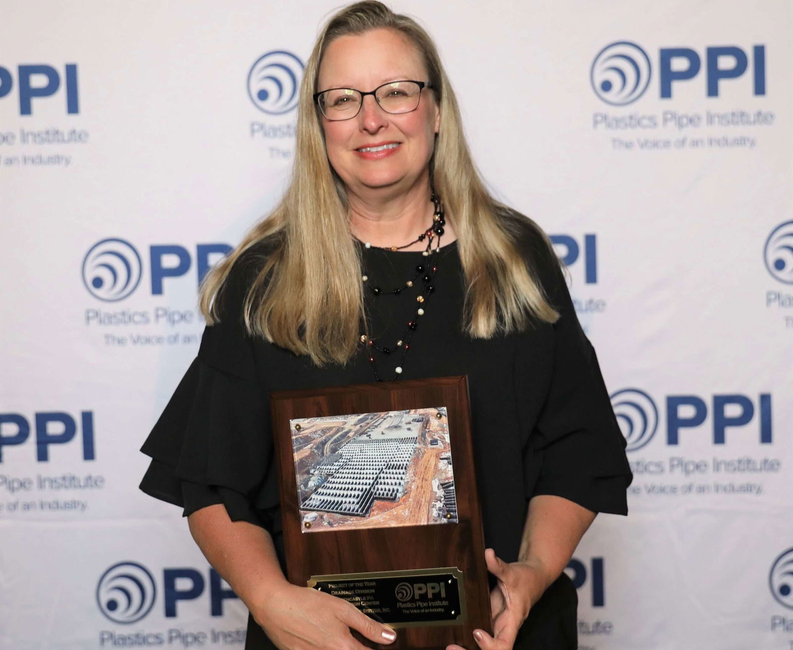 Tori Durliat, director of marketing for Advanced Drainage Systems, Inc. with the Project of the Year plaque.