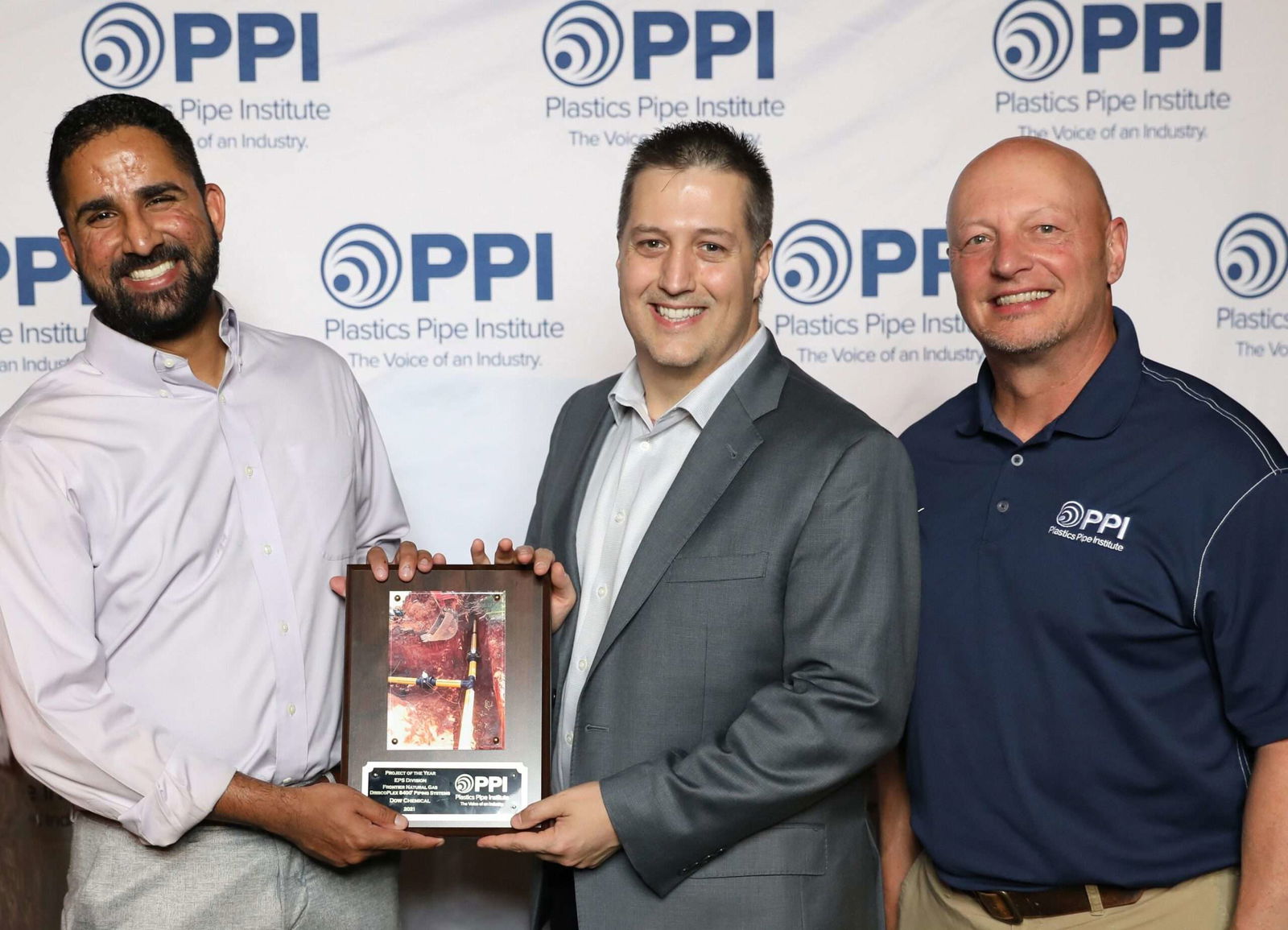 Nik Koganti of Performance Pipe (left) and Dell Doyle of Dow (center) with PPI’s Randy Knapp, the director of engineering for the association’s Energy Piping Systems Division.