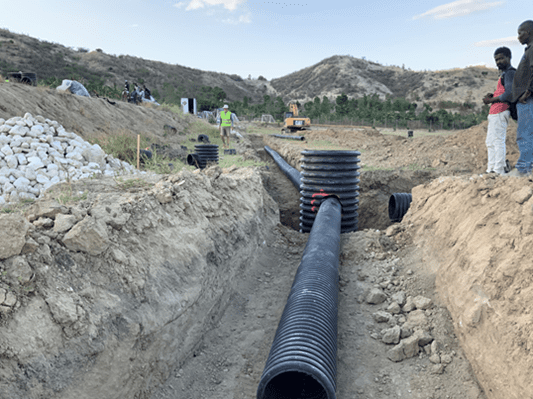 Project Living Hope, a charitable organization, has a vision to create a social center in rural Haiti supporting underprivileged youth in the area. This includes creating a massive sports facility with soccer fields, a housing complex, a vocational center and a large community hall. After the drainage requirements were identified for the soccer field, it was determined that the low material and installation costs associated with corrugated high-density polyethylene (HDPE) pipe provided the best solution compared to other piping alternatives, and allowed the Project Living Hope to complete the soccer field drainage improvements in its entirety, rather than in phases.