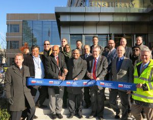 Queens Library leadership, Stalco Construction, Marpillero Pollak Architects, NYC Department of Design and Construction, and local and national political leaders opened the new, $32.4 million Elmhurst Community Library, expected to be the busiest public library branch in the U.S., serving 1.2 million visitors annually. Back row, left to right: DDC Associate Commissioner of Public Buildings Eric Boorstyn, Stalco Construction Vice President Joseph M. Serpe, Stalco Superintendent Kevin Strebel, and DDC Deputy Commissioner of Public Buildings Tom Foley. Second row, left to right: Stalco President Alan Nahmias, DDC Junior Project Manager Shaima Rizvi, DDC Project Manager Davood Ghanizadeh, Stalco Assistant Project Manager Jason Vasquez, and DDC Deputy Director of Public Buildings Winston Sealey. Front row, left to right: DDC Executive Director of Public Information Ian Michaels, DDC Associate Commissioner of Public Buildings Mario Siribana, DDC Associate Commissioner of Public Buildings Oscar Gonzalez, DDC Commissioner Feniosky Peña-Mora, New York City Council Member Daniel Dromm, Marpillero Pollak Architects Principal Sandro Marpillero, and DDC Program Director for Libraries Owen Foote. Photo by Peter Wilk/Wilk Marketing Communications