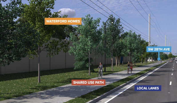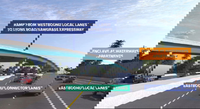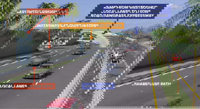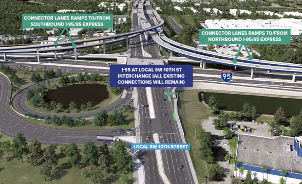 In the new configuration, SW 10th Street Connector Lanes will serve regional traffic, providing a direct, limited-access link as the Sawgrass Expressway between Florida’s Turnpike and I-95. A separate local SW 10th Street will be transformed into a “complete street” with a 12-foot-wide shared-use path for pedestrians and cyclists, landscaped buffers, enhanced lighting, lower speed limits (35 mph on local lanes) and improved access to local properties.