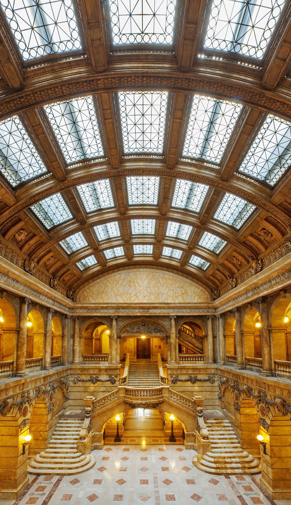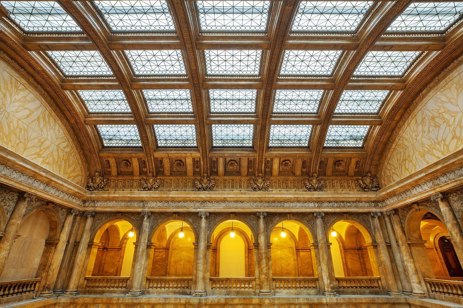While many of the courtyard’s sumptuous finishes were imported from Europe, the skylight was fabricated just a couple of dozen blocks north of the building itself, in Chelsea. The monumental atrium space features an extraordinary double staircase of Tuscan marble imported from Siena, which leads to upper-level balconies. The walls and columns are lined with matching Siena marble, with blood-red marble roundels and elaborate carvings that include garlands of fruit and foliage. Mosaic murals by William DeLeftwich Dodge feature the signs of the zodiac. For the floor, the original architect chose pink marble from Tennessee and blue marble from Belgium, laid out in geometric patterns. When it was built, this atrium was the grandest, most expensive, and most controversial – due to the cost and opulence – part of the building.