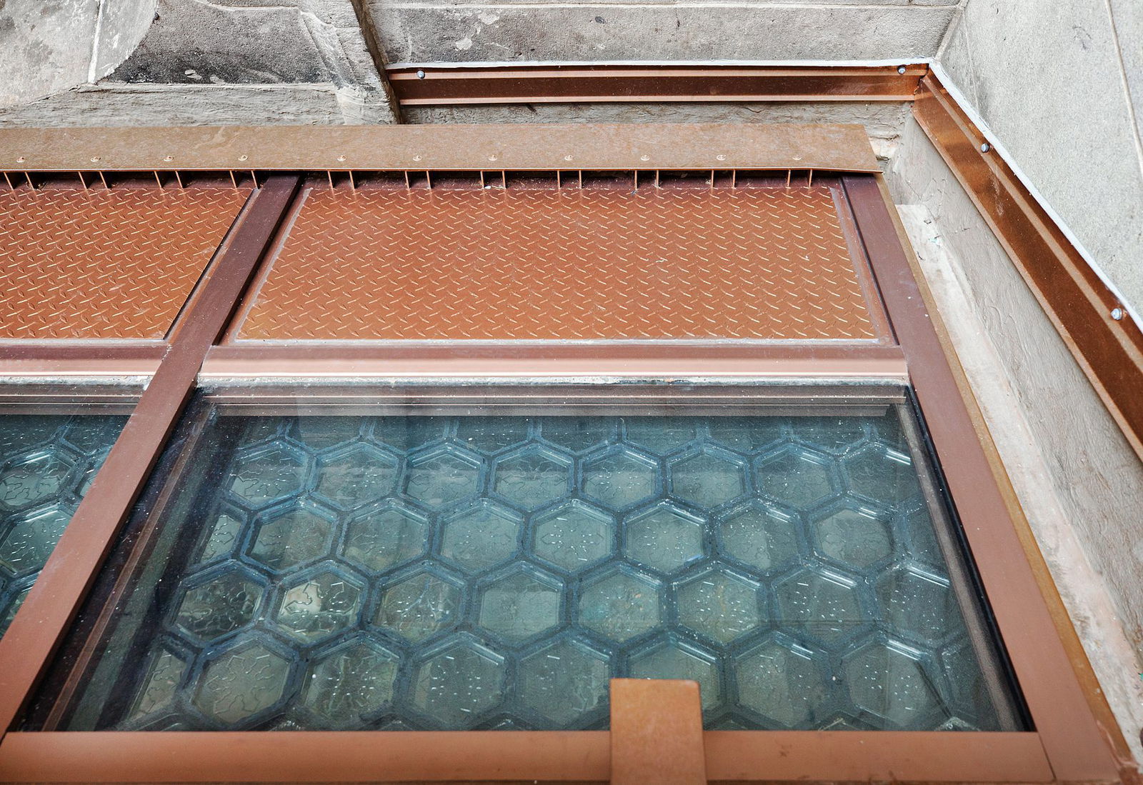 While the original intent was to salvage as many glass block units as possible and install replica units to replace damaged ones, extensive corrosion of the cast iron frames made it impossible to remove any units without breaking them. Instead, molds for new glass blocks were taken from castings of existing blocks. New hexagonal glass blocks were casted by Gillinder Brothers to match the originals, including the embossed snowflake pattern on the surface, while Wemco Casting fabricated new cast iron frames.