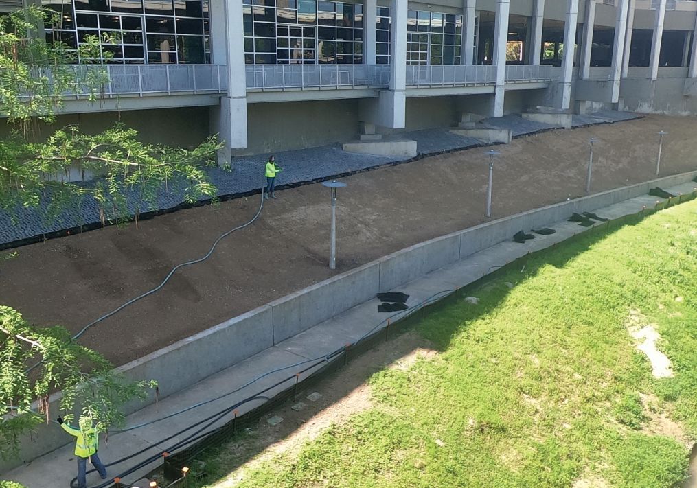 Workers hand-installed more than 3,000 articulated concrete blocks along the base of the building to 12 feet (3.7 meters) down the slope as an added layer of protection. Underneath the blocks, the team installed a Turf Reinforcement Mat to maintain consistency down the slope.