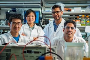 Rice University researchers are developing ionic water-treatment technology that saves money and energy by selectively removing only hazardous contaminants and ignoring those that are harmless. From left: Kuichang Zuo, Qilin Li, Amit Jain and Rafael Verduzco. (Credit: Jeff Fitlow/Rice University)