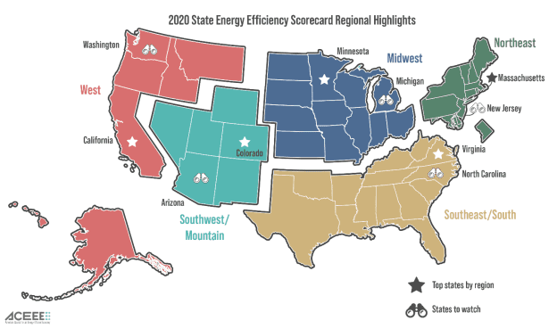 Washington, DC—More U.S. states have adopted or advanced new energy-saving targets and vehicle and appliance rules, but COVID-19 slowed other efficiency efforts, according to the 2020 State Energy Efficiency Scorecard released Wednesday. For the first time in four years, California took first place nationwide, edging out Massachusetts, the leader in the Northeast. Other regional leaders include Minnesota in the Midwest, Colorado in the Southwest, and Virginia in the South.