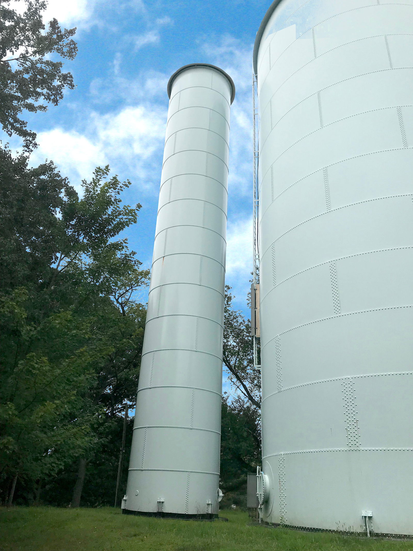 For the tank’s exterior restoration, SUEZ installed a full containment tent to encapsulate the tower, and protect nearby structures and vehicles from dust and overspray during blasting and coating operations. Starting with the tank’s legs and underside before moving to the top, the SUEZ crew blasted and coated the entire exterior. They first applied primer and stripe coats of Sherwin-Williams Corothane® I – GalvaPac 1K zinc primer. The moisture-curing primer gave the crew flexibility for the applications, enabling applicators to spray the coating even during very humid conditions. Next, the crew applied an intermediate coat of Sherwin-Williams Acrolon™ 218 HS acrylic polyurethane, a fast-drying coating that delivers excellent color and gloss retention for exterior exposures.