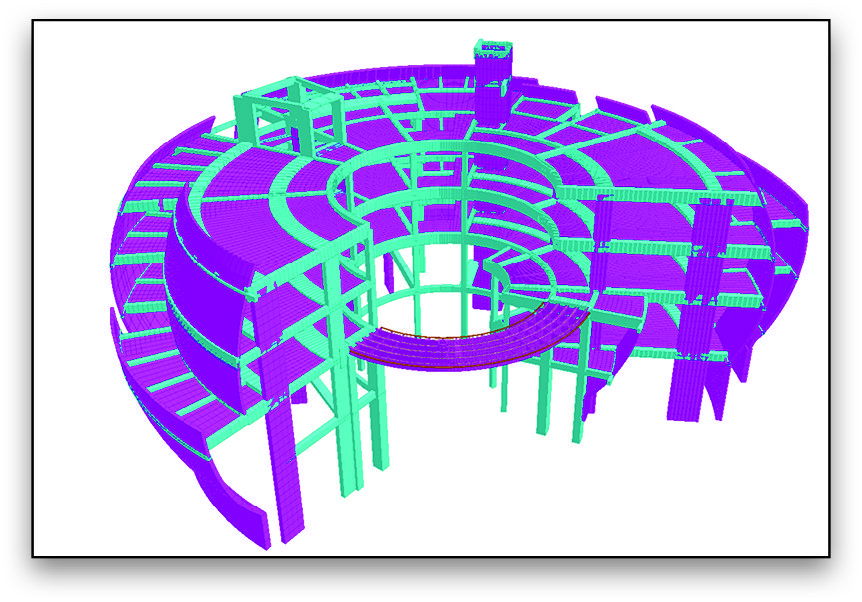 The 3D structural model was prepared easily by importing the vertical curved profile of the wall from AutoCAD into STAAD.Pro and then using the extrude, mirror, and copy features to model the curved wall.