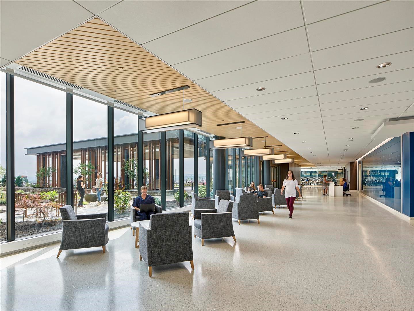 The building is designed to be gracious in its spatial and experiential qualities yet responsible in its use of space and application of materials. Inspired by the region’s local quarries, the precast panels on the building’s exterior express the layers of limestone in the rock strata, while metal accents are a nod to the industrial heritage of York. The interior color palette draws inspiration from geodes and other natural phenomena, creating a warm and healing environment for patients.