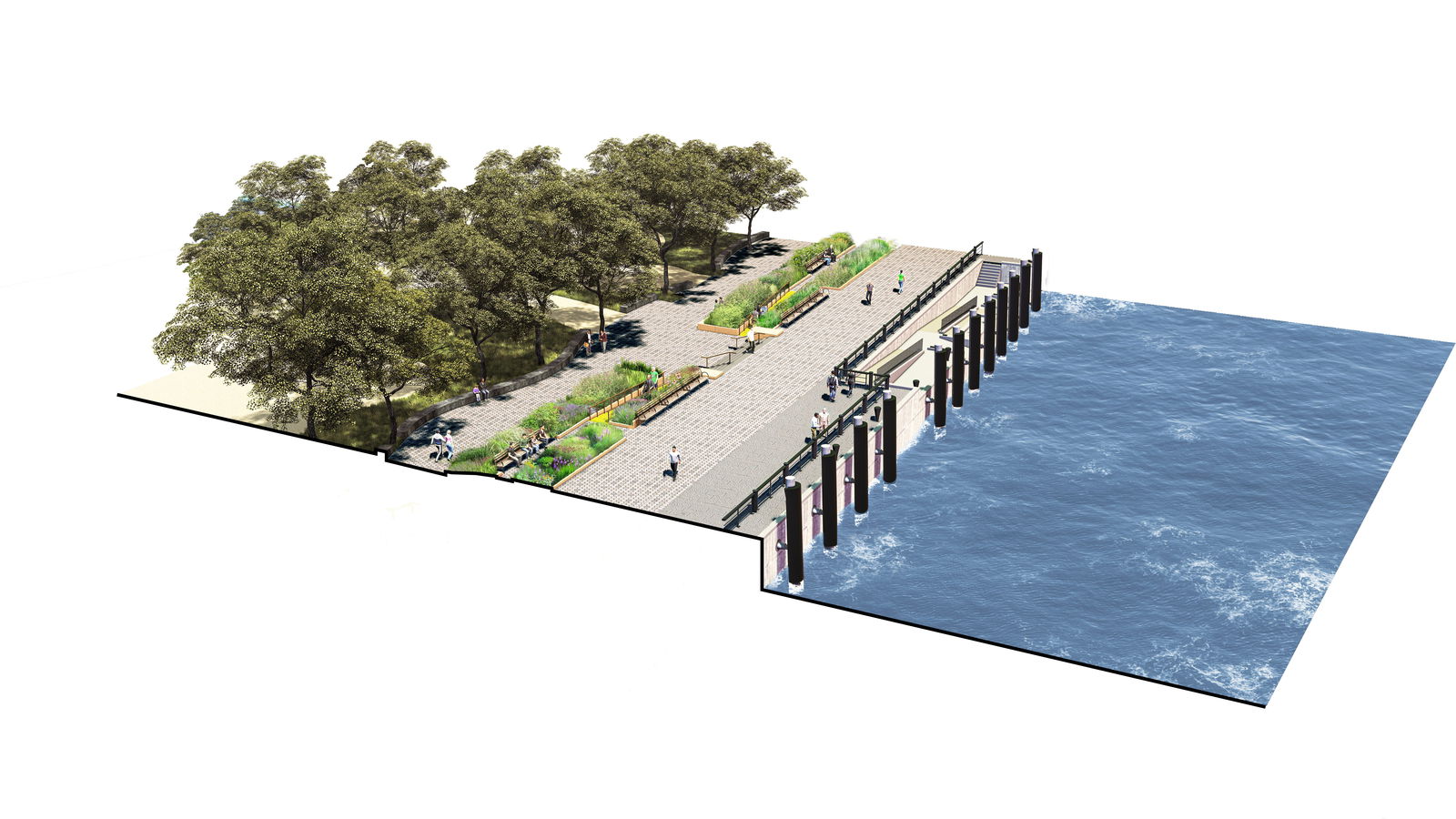 The Battery currently sits at an elevation that will be submerged as sea levels rise. As part of the project, the wharf at the southern tip of Manhattan will be reconstructed, raising the waterfront esplanade approximately 5 feet above its current elevation—11 feet above Mean Sea Level—to protect the park and nearby community. Several complex issues will be addressed in the design, including in-water construction, interior drainage, and integration of a new wharf elevation with the existing parkland.