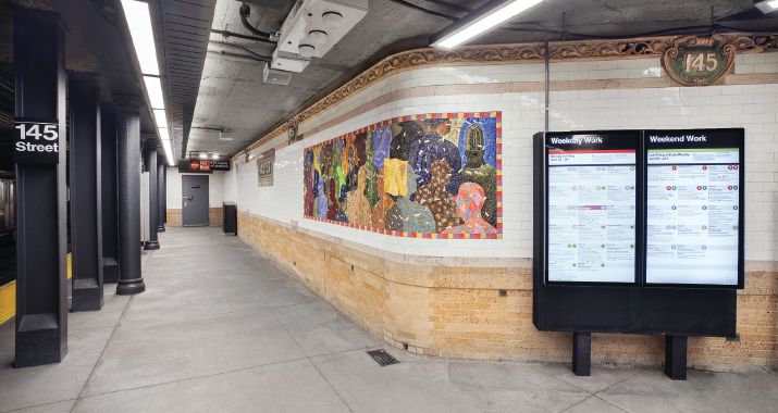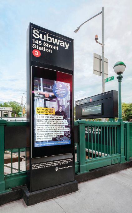 Custom information screens were placed so passengers can view train arrival times and status update alerts before paying and entering the turnstiles. Two digital dashboards were installed near the booth. A traditional, oversized subway map also was incorporated in the refurbished space. However, it’s now displayed in a newly designed illuminated case with black metal trim.